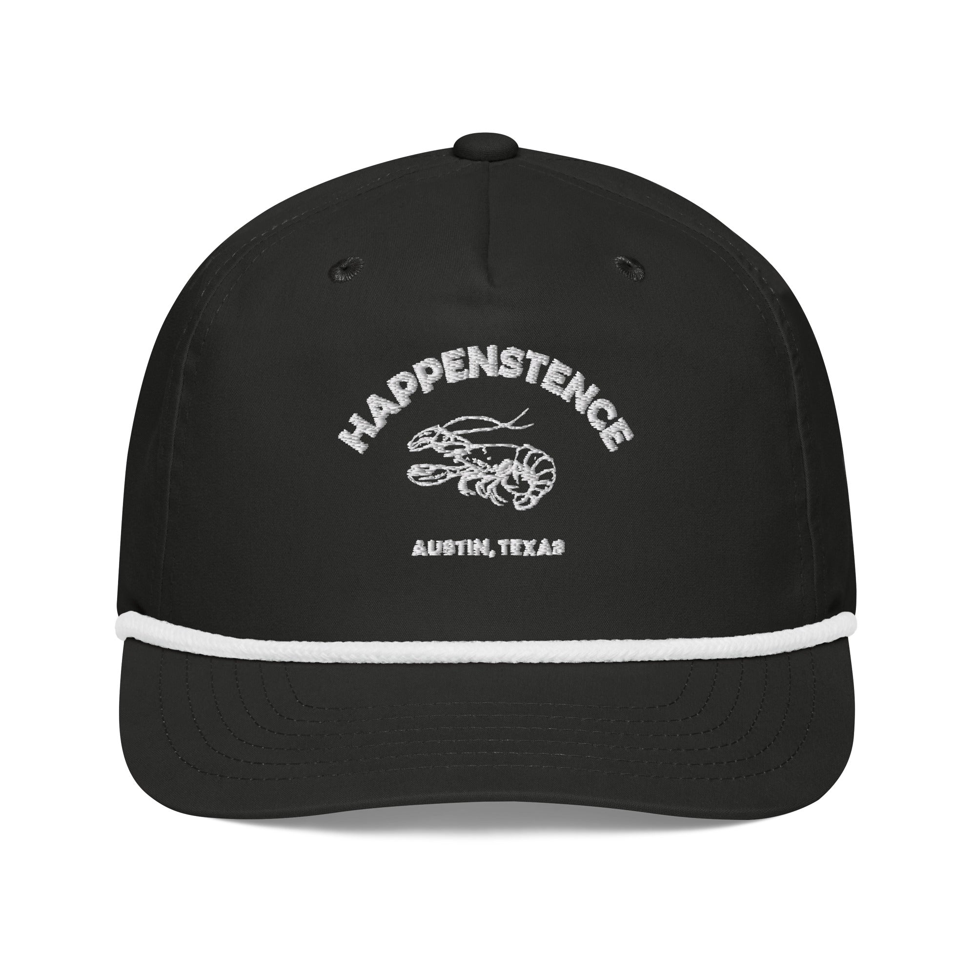 The embroidered Happenstence Crawfish design keeps your Austin roots front and center, while the all-black fabric and white rope give it that clean, timeless style. Whether you're hitting up the crawfish boil or kicking back with friends, this hat has you covered.