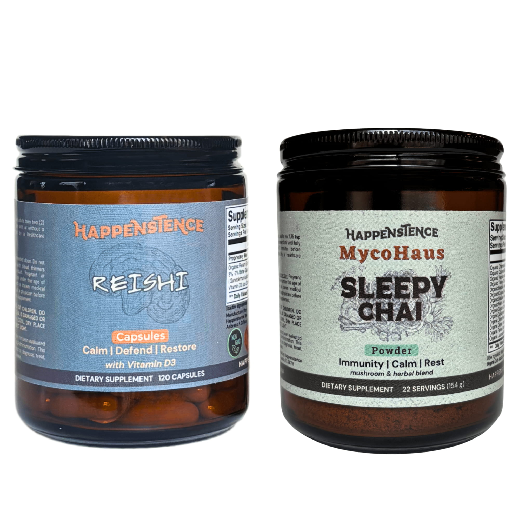 This stack includes our spiced MycoHaus Sleepy Chai powder—formulated with Reishi, Turkey Tail, and Valerian—and our Reishi Capsules, known for supporting stress reduction, emotional balance, and immune function.*
